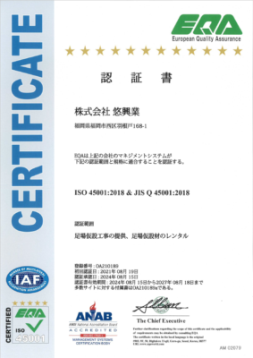 | ISO認証 | ISO 45001:2018 & JIS Q 45001:2018